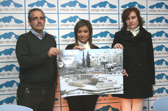 Las concejalas de Festejos y Cultura, Paqui Mantas y Mª del Mar Domene, respectivamente, junto al presidente del Centro Comercial Abierto de Priego, Antonio Mª Galisteo, han presentado el programa de actividades navideñas y el cartel anunciador de la Navidad 2010, que comenzarán este próximo martes, 7 de diciembre, con el encendido del alumbrado extraordinario.