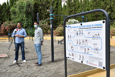 El concejal de Juventud y Deportes, Jesús Sánchez y el de Infraestructuras, Javier Ibáñez, han presentado la puesta en marcha del nuevo parque Calistenia, ubicado junto a la Pista Cubierta José María Camacho de la Ciudad Deportiva Carlos Machado de Priego de Córdoba.