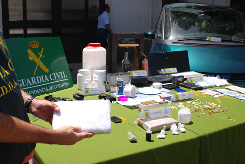 Fruto de estos registros, la Guardia Civil ha logrado desmantelar el laboratorio de cocaína de la organización, que estaba ubicado en un domicilio de Córdoba, donde se han intervenido prensas, dos (2) kilogramos de sustancia de corte, y útiles para la confección de papelinas. Así mismo, la Guardia Civil ha intervenido el resto de otros registros efectuados pequeñas cantidades de cocaína, dispuesta para su distribución y venta, así como otros y otros cinco kilos de sustancia de corte (5). También la Guardia Civil ha intervenido al grupo de narcotraficantes, más de 3.000 € procedentes de la venta de drogas, numerosas joyas procedentes del pago de la droga, varios paquetes con dinero falsificado, 15 teléfonos móviles que eran utilizados para los contactos entre los miembros de la red, dos vehículos de gama alta, numerosa documentación y varios soportes informáticos que están siendo objeto de estudio.